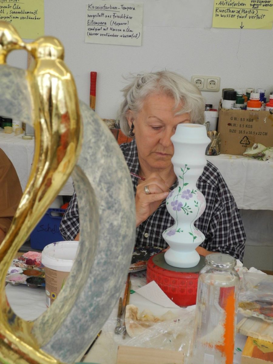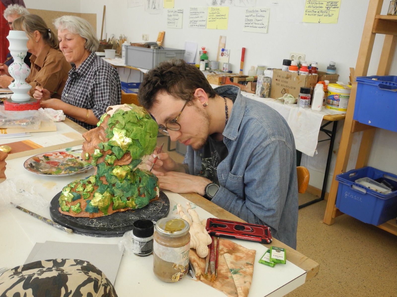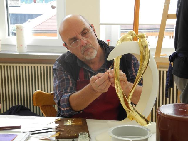 In diesem Kurs können Sie selbst mitgebrachte Skulpturen oder Objekte farbig gestalten, vergolden, versilbern und dabei auch mit den Farben und den Oberflächen experimentieren. Dabei gibt es keine Einschränkungen bei den zu gestaltenden Werkstücken: abstrakte Objekte, jede Art von Skulpturen, Treibholz, glatte Holzplatten und Rahmen – alles ist möglich! Der Kursleiter übernimmt die fachliche Beratung und leistet Hilfestellung, z.B. bei der Wahl der richtigen Technik, Farbgebung und Endgestaltung. Die Vielfalt an mitgebrachten Werkstücken und Ideen sorgt für eine inspirie- rende Atmosphäre, von der alle Teilnehmer profitieren.