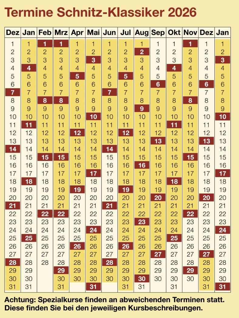 Im Mittelpunkt steht die individuelle Betreuung aufbauend auf Ihrem Wissen und Können. Sie wählen Ihr Projekt gemeinsam mit dem Kursleiter aus, der Sie bei jedem Arbeitsschritt unterstützt. Anhand von Vorlagen mit unterschiedlichen Schwierigkeitsgraden können Sie genau das richtige Projekt für sich auswählen. Bestehende schnitztechnische Probleme werden besprochen und nach Möglichkeit gelöst. Wer schon vorab ein bestimmtes Thema im Kopf hat, kann dieses im Kurs umsetzen oder sich alternativ von einem unserer Themenvorschläge inspirieren lassen. Beachten Sie auch unsere Themenkurse.