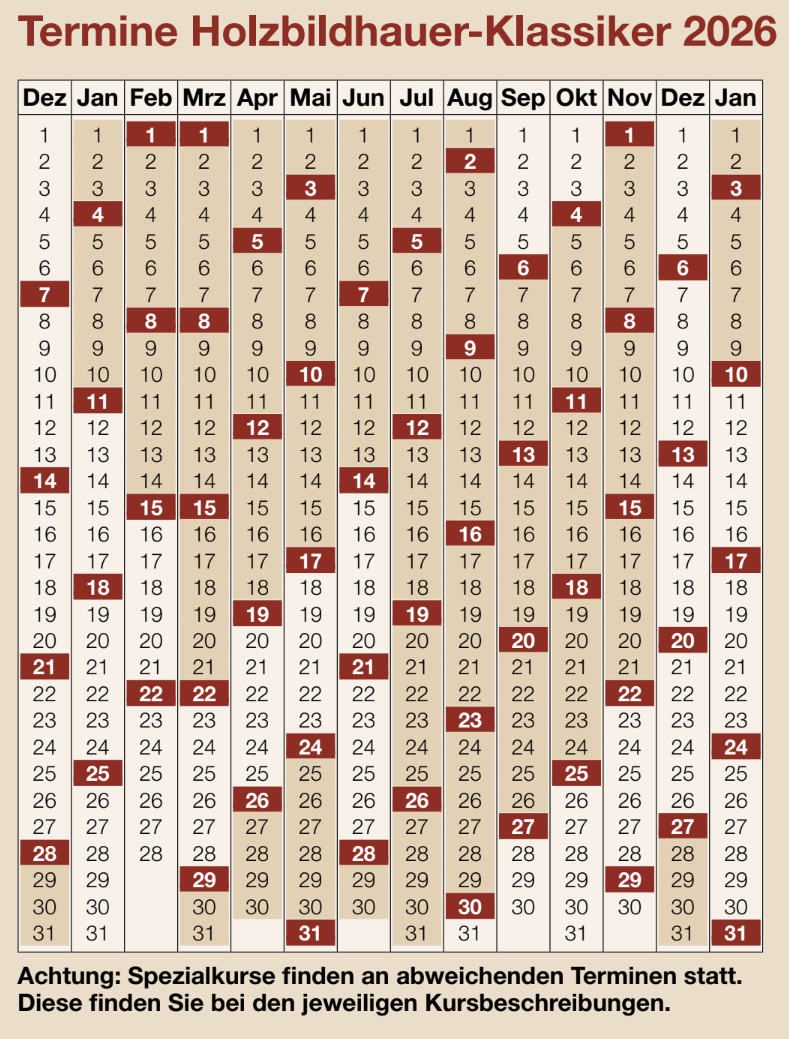In diesem Einführungskurs machen Sie erste praktische Erfahrungen im Umgang mit Holz und Werkzeug. Sie lernen die grundlegenden Techniken der Holzbildhauerei kennen – anschaulich und Schritt für Schritt vermittelt.