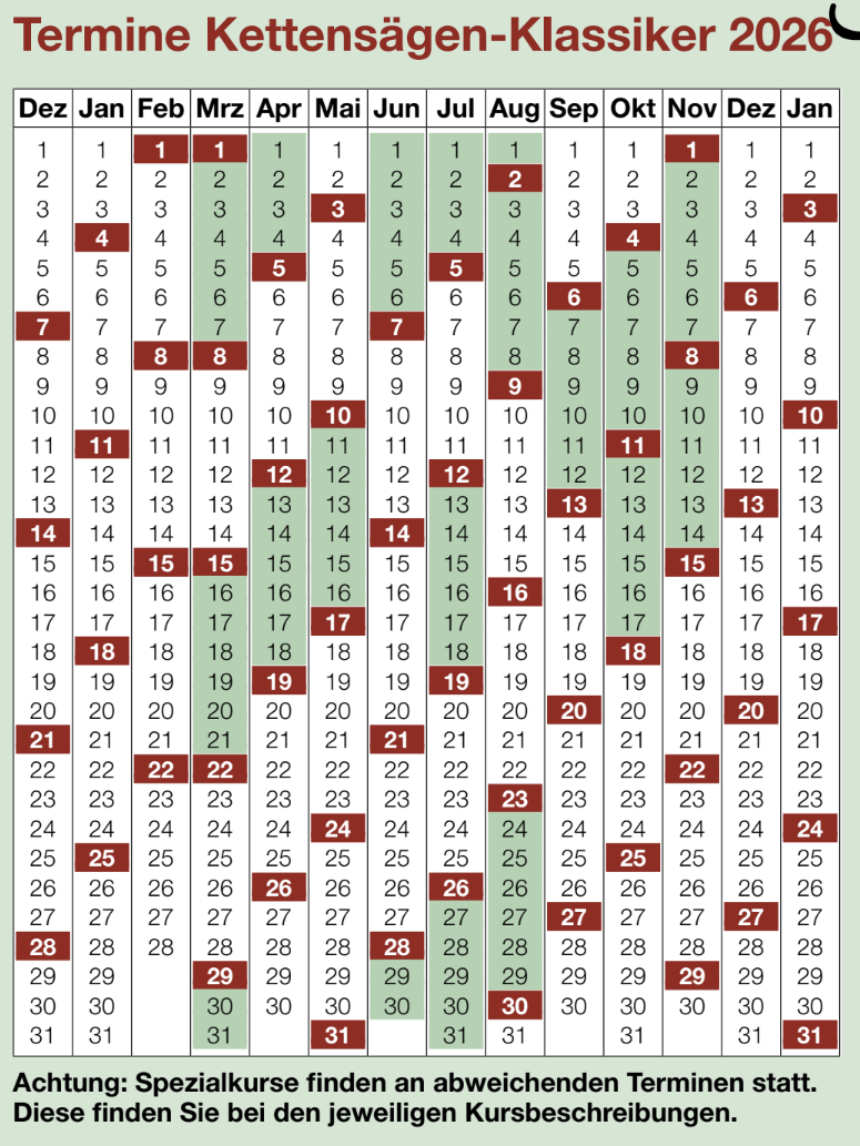 Kurszeiten wie beim Wochenkurs ganztägig. Kursvorbesprechung am Mittwoch um 18.00 Uhr.
